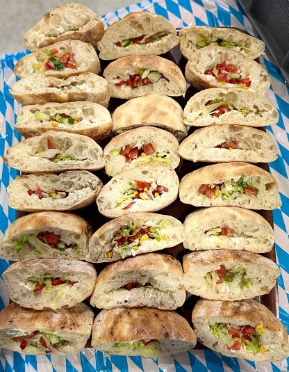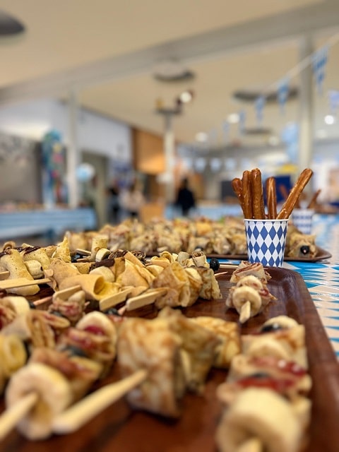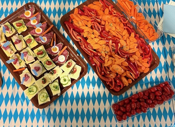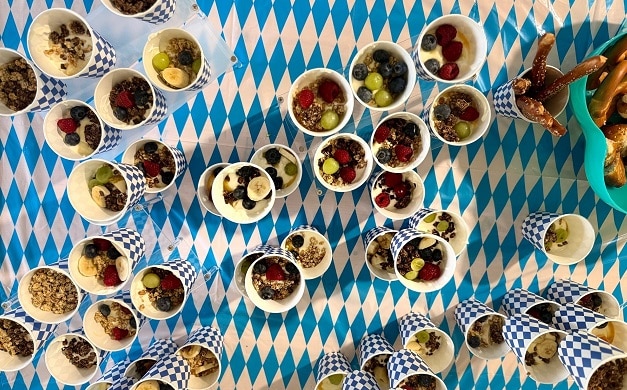 Obstspieße, frische Vollkornbrote mit Frischkäse-Dip, Gemüsedöner (der niemals fehlen darf) und natürlich der absolute Hit: Der „Wiesn-Joghurt-Becher“